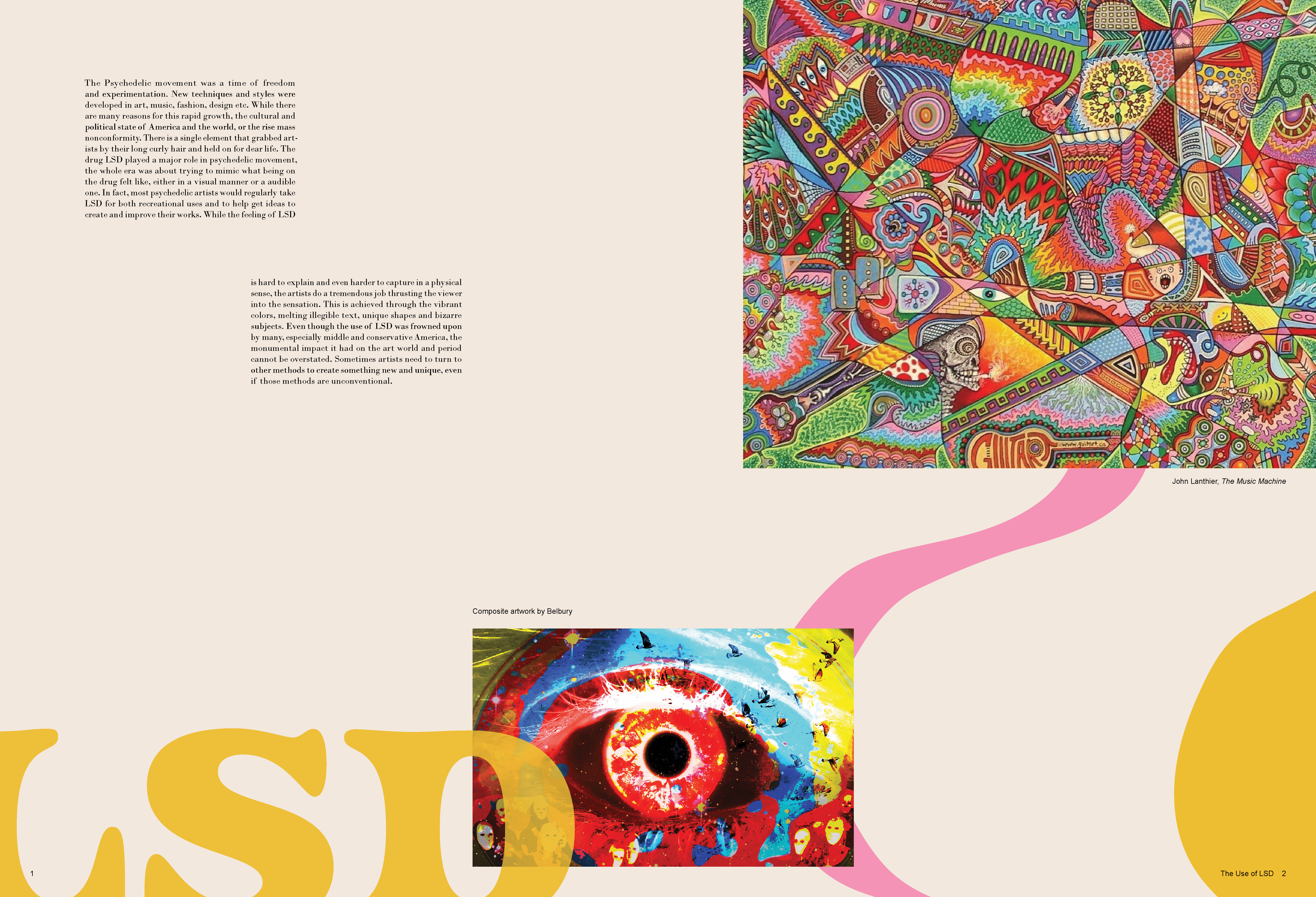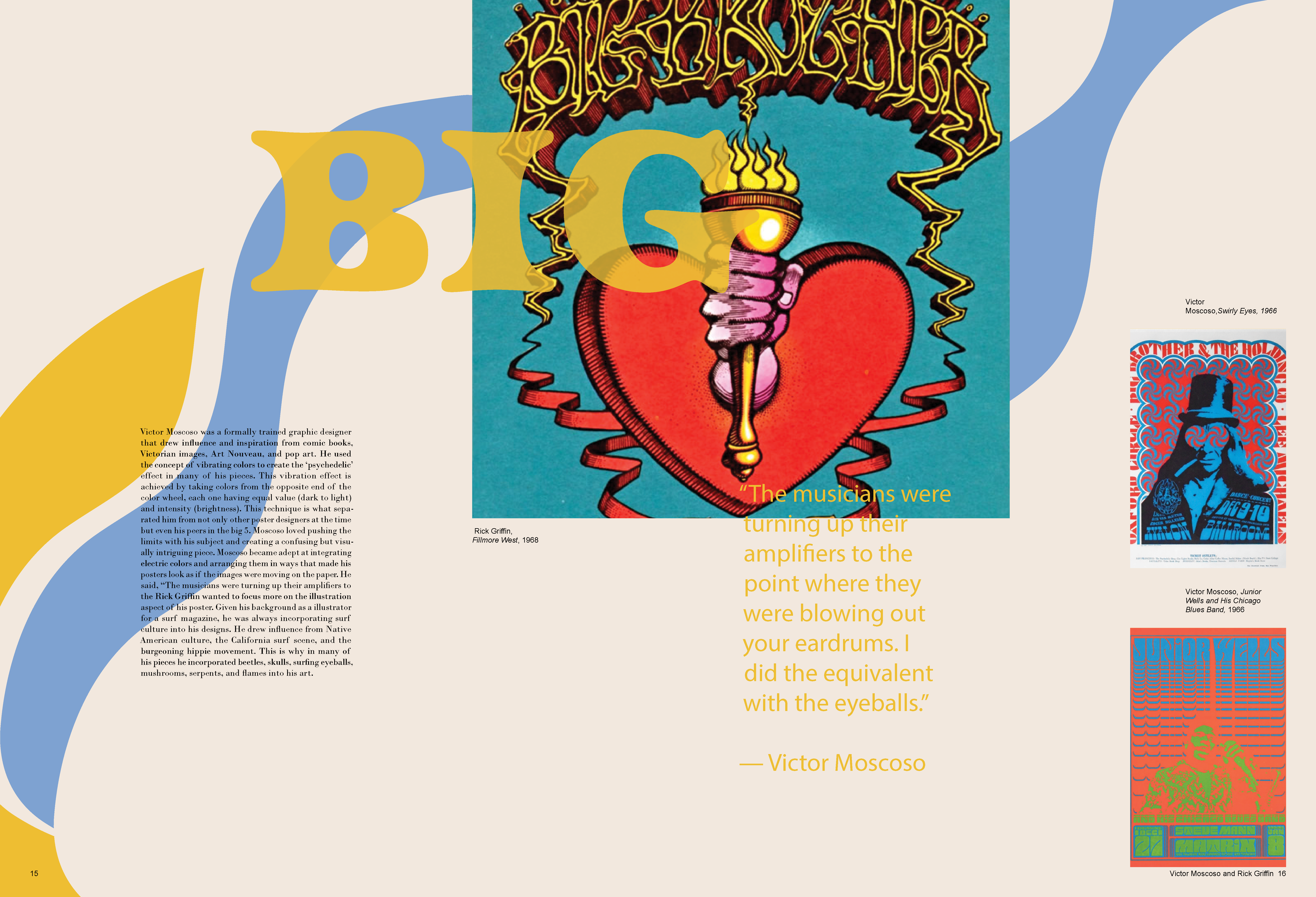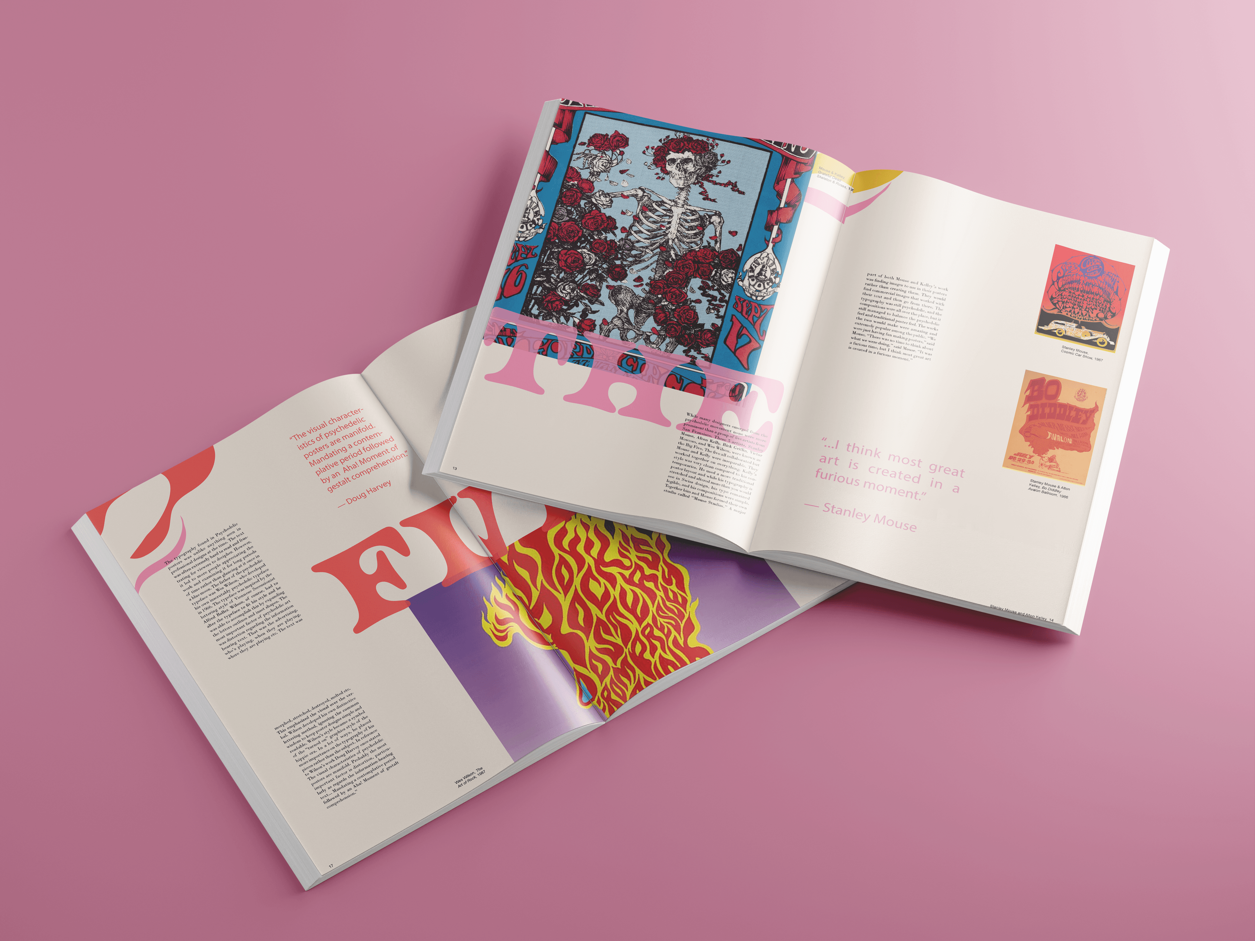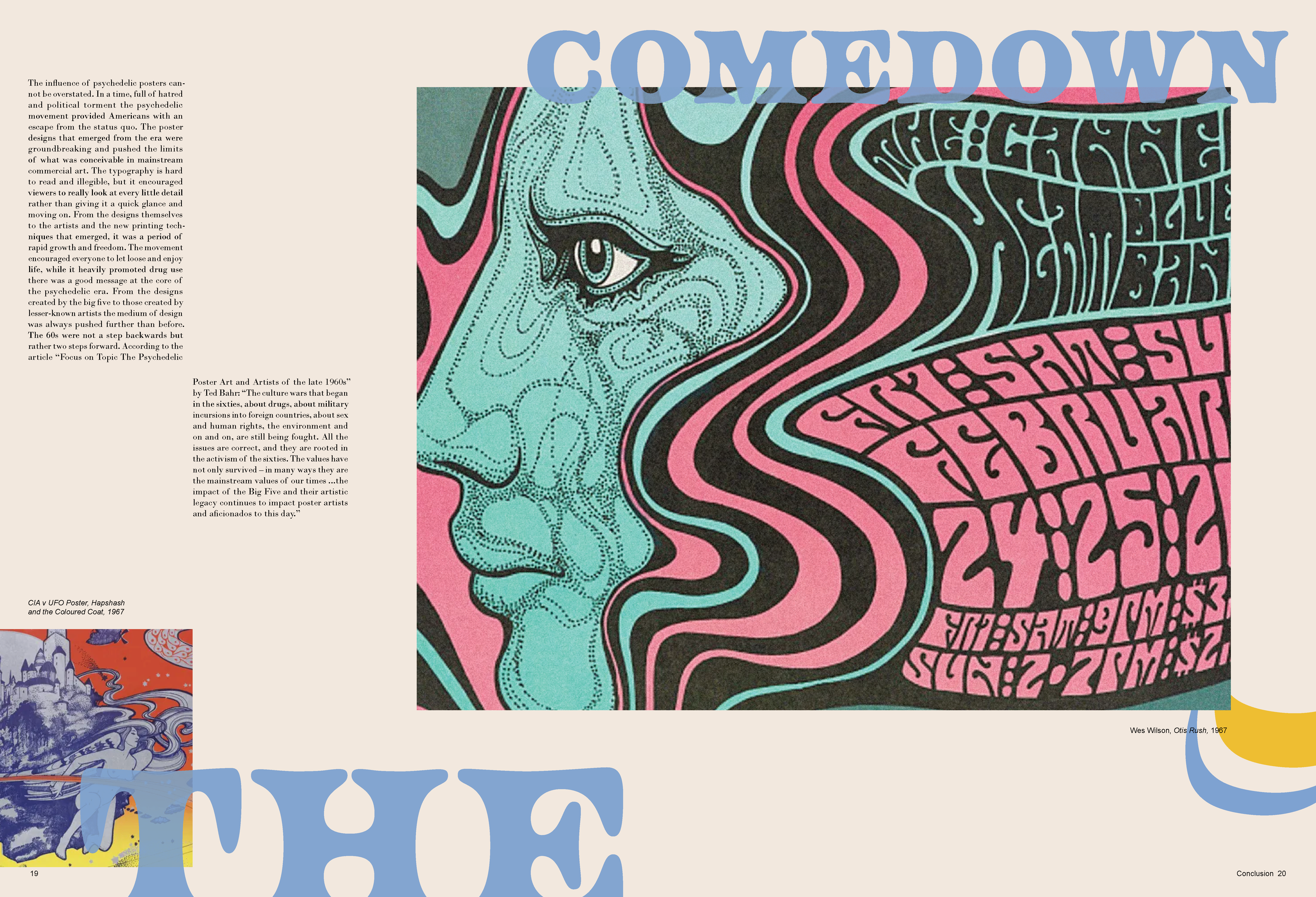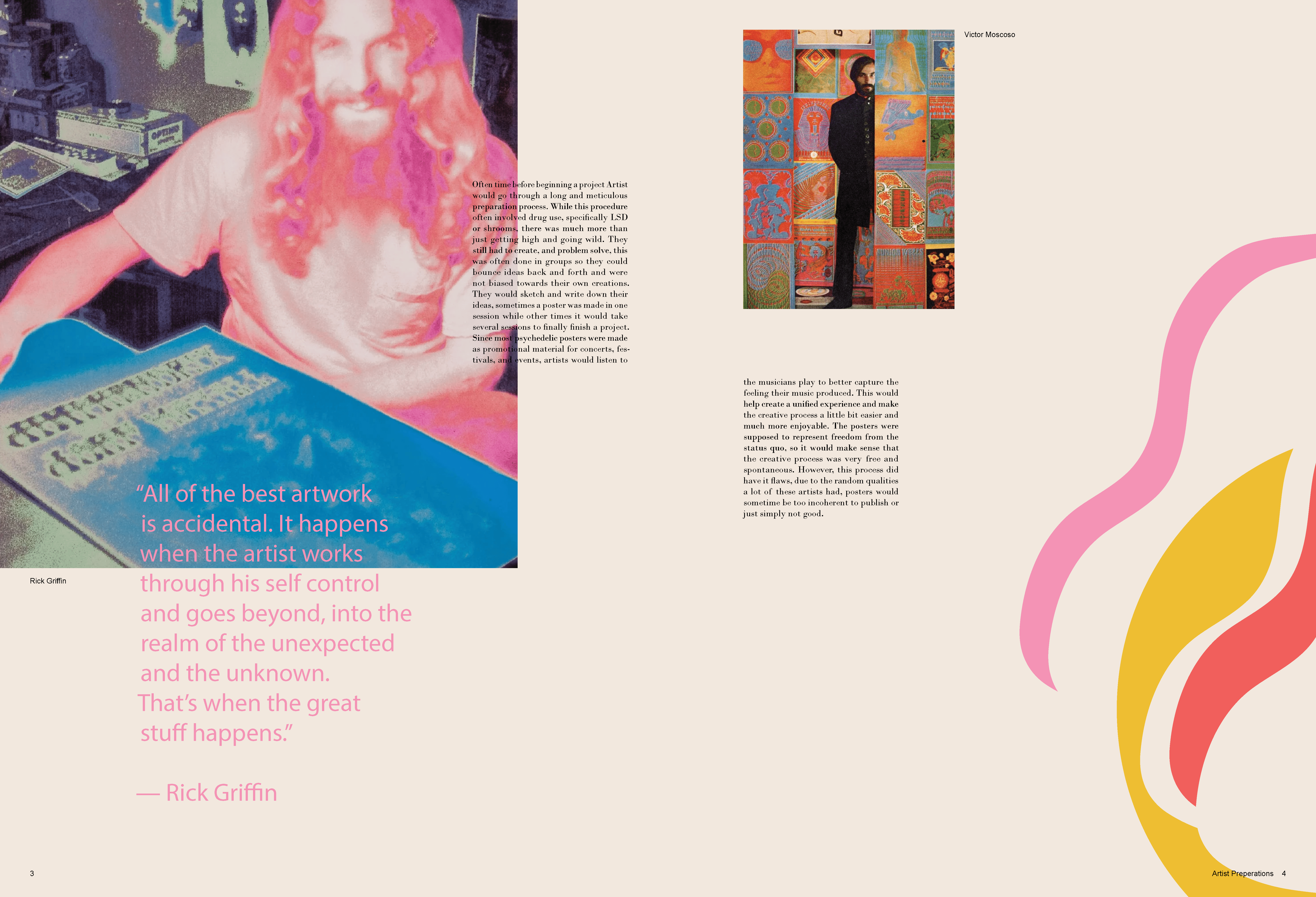 A monograph made to represent the poster designs of the Psychedelic 60s and 70s. In order to mimic this distinctive style, overlapping elements, vibrant colors and organic shapes were used on each spread, while the text still remains legible.