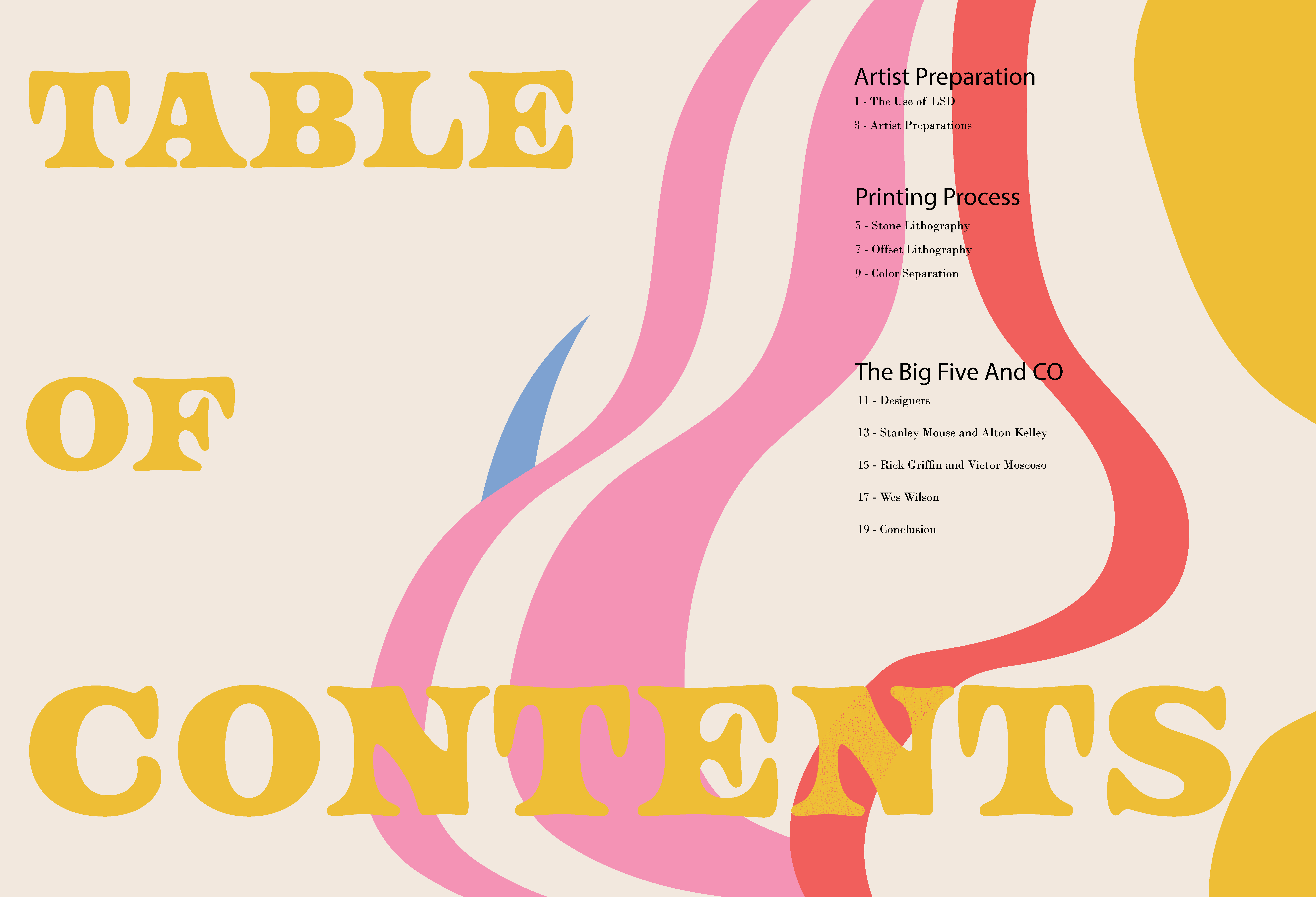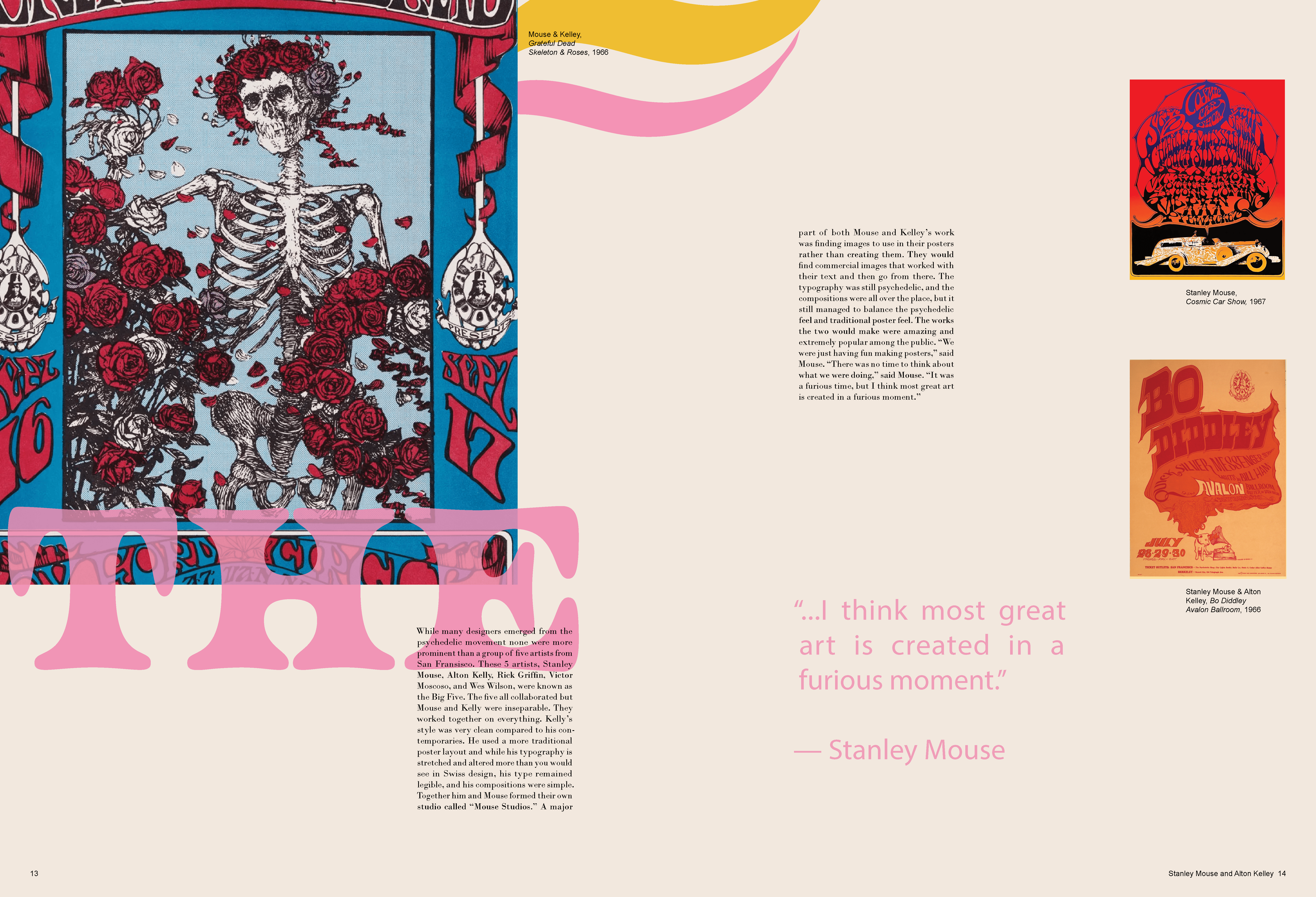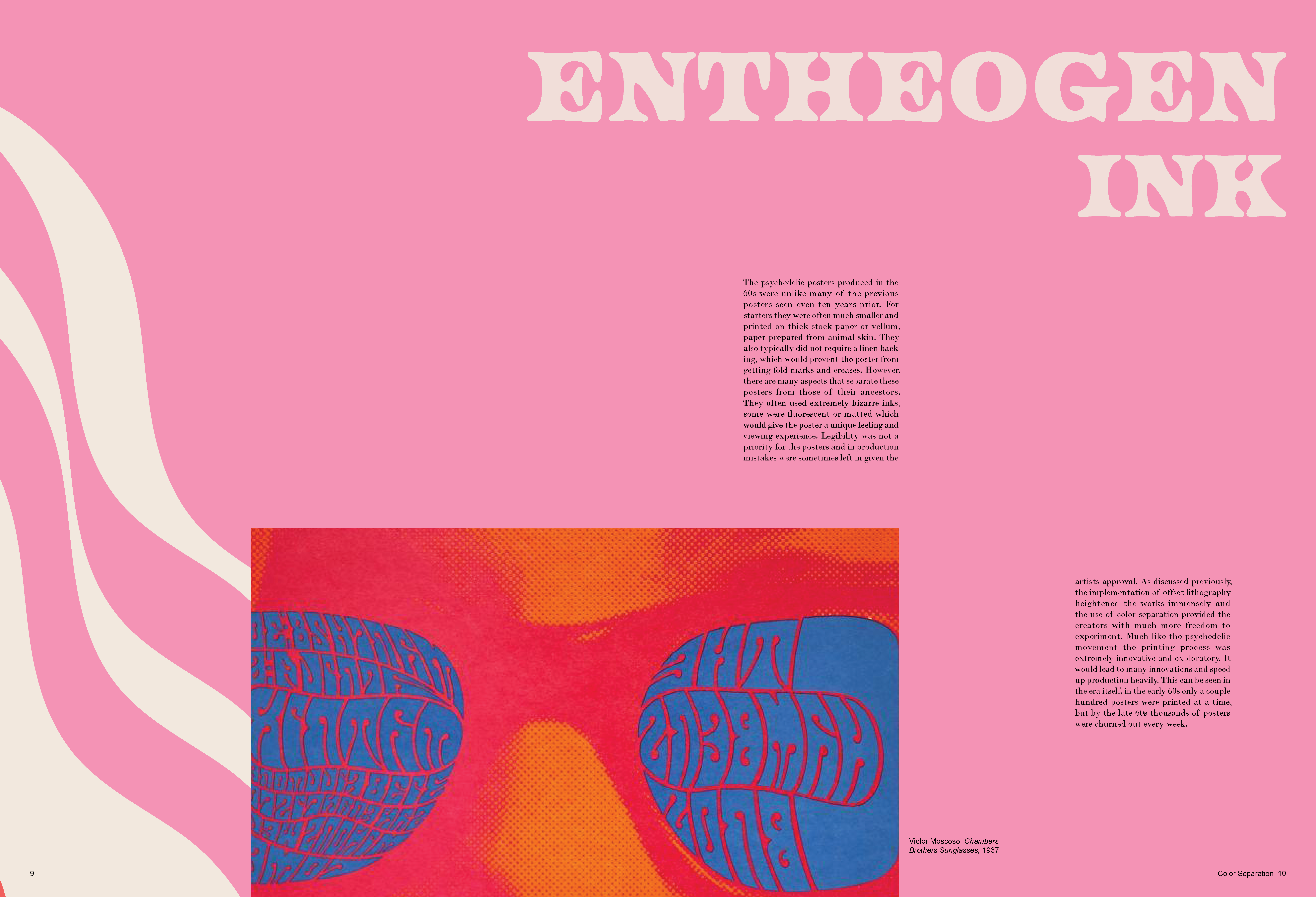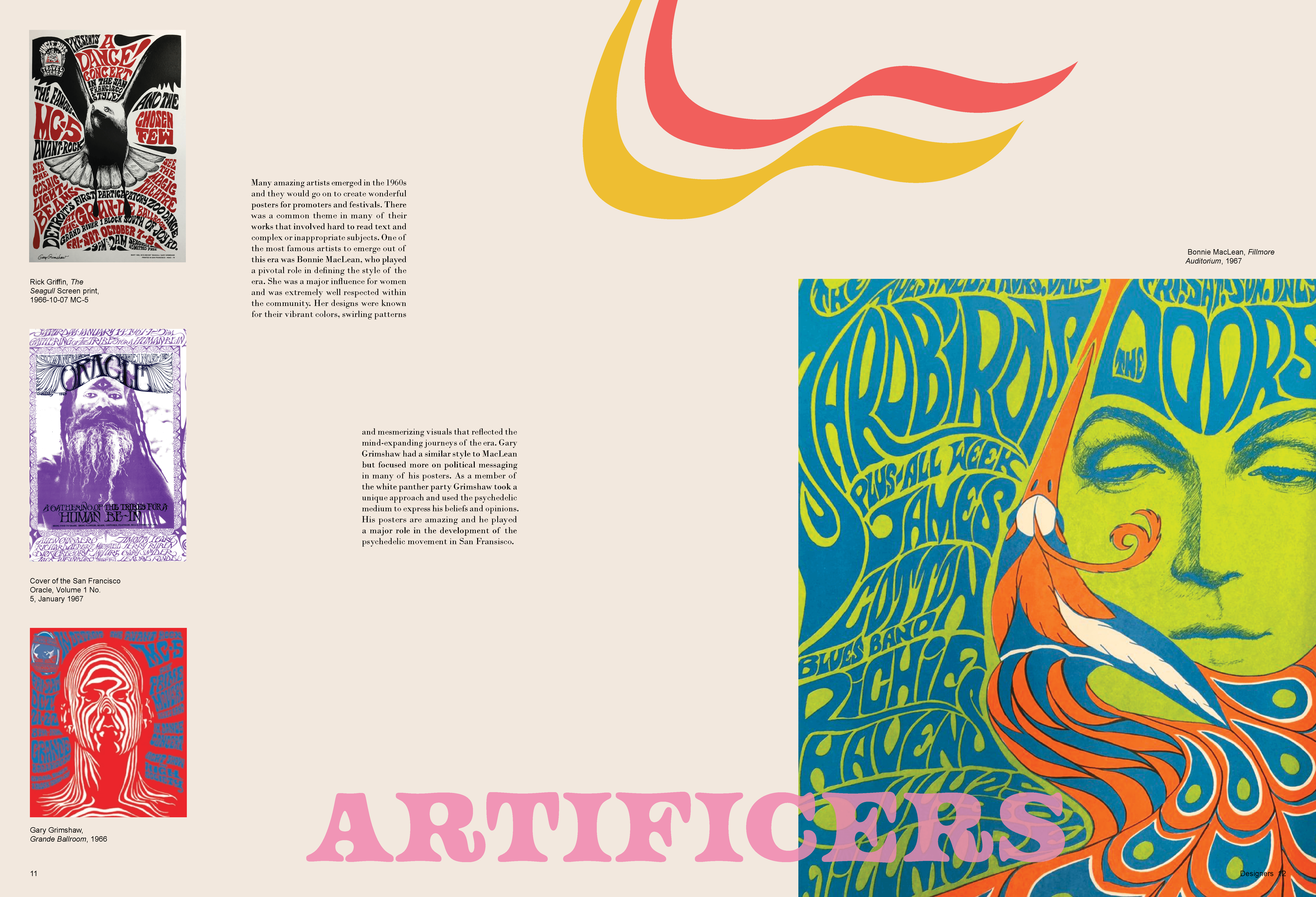 A monograph made to represent the poster designs of the Psychedelic 60s and 70s. In order to mimic this distinctive style, overlapping elements, vibrant colors and organic shapes were used on each spread, while the text still remains legible.