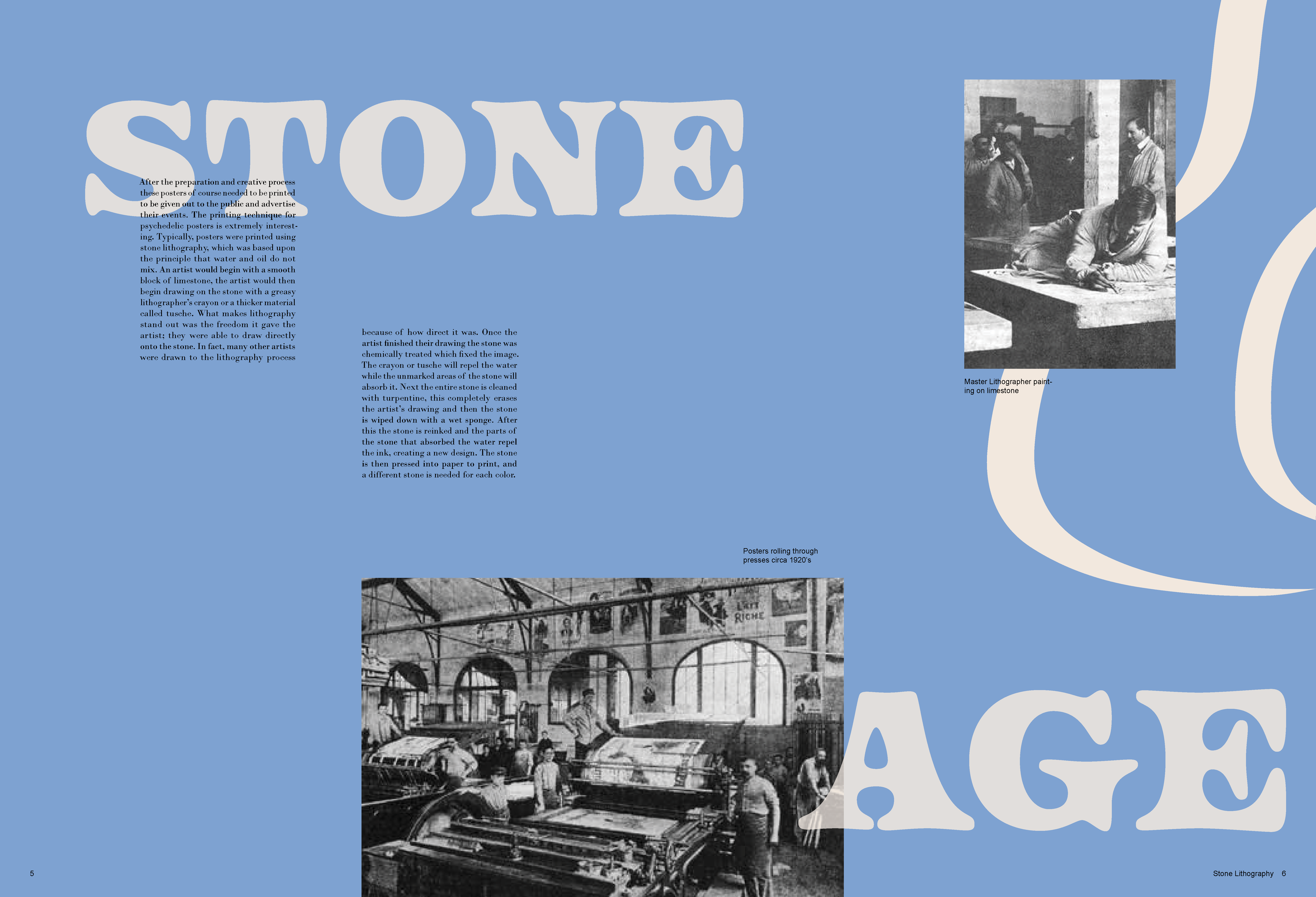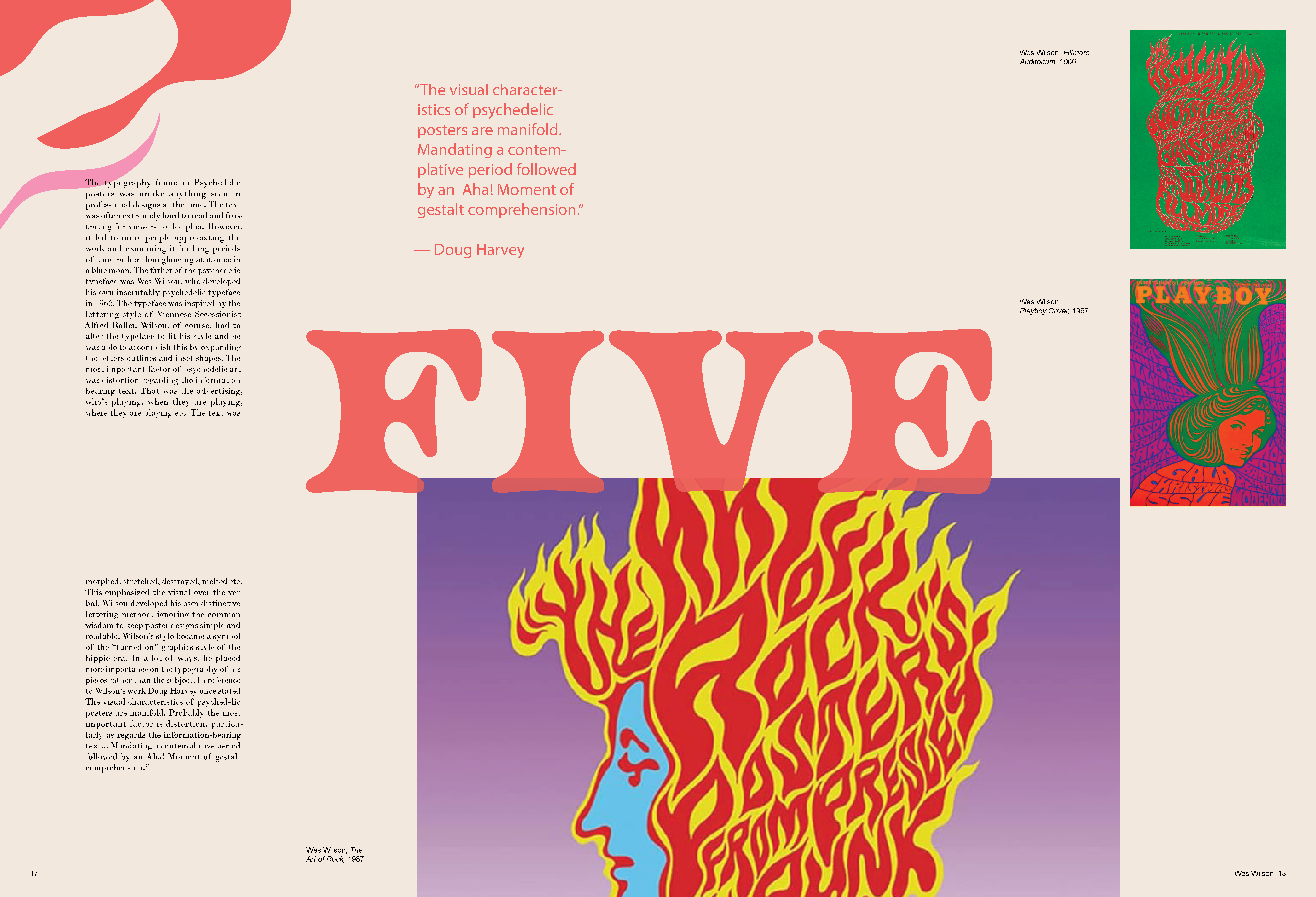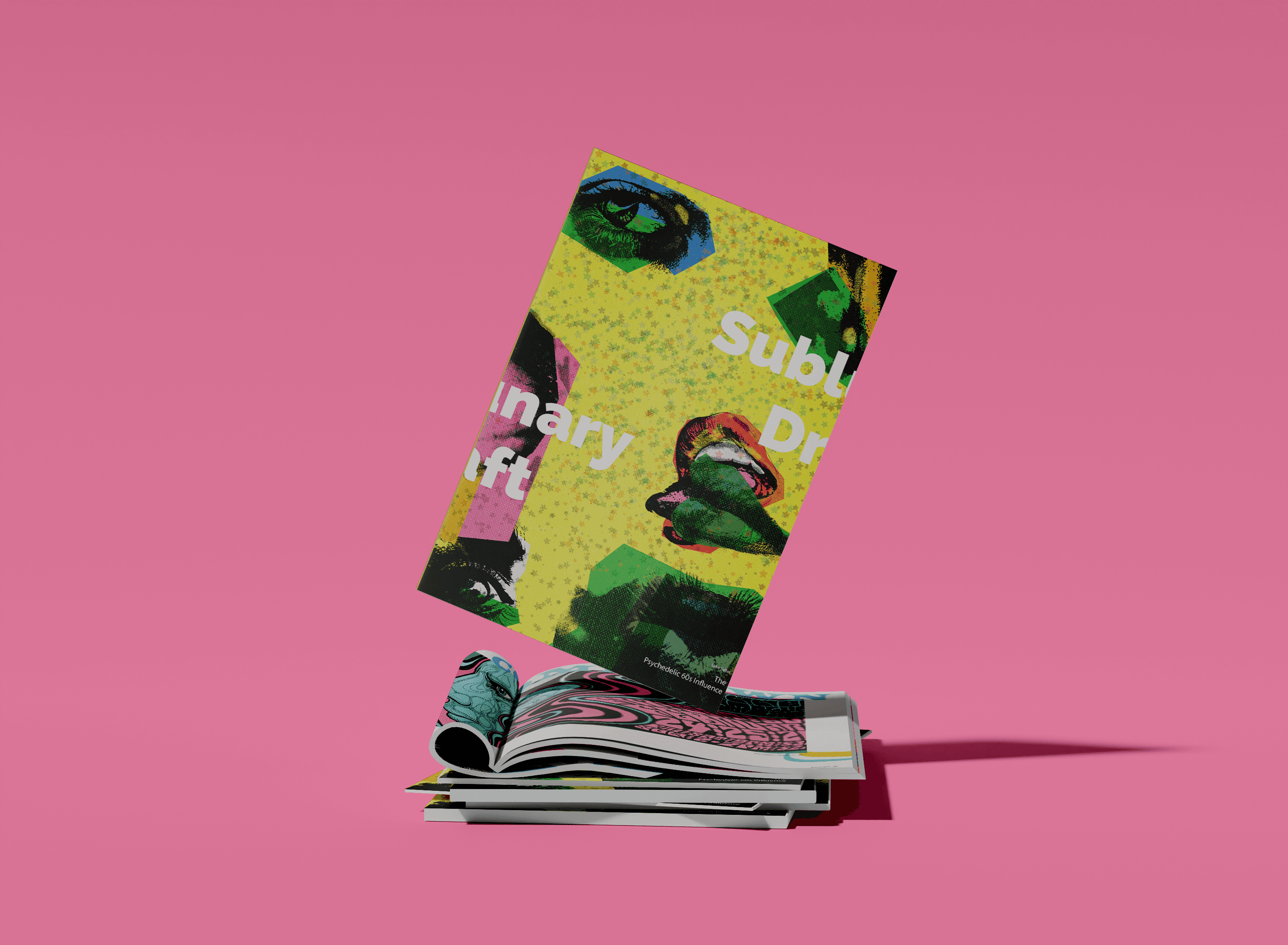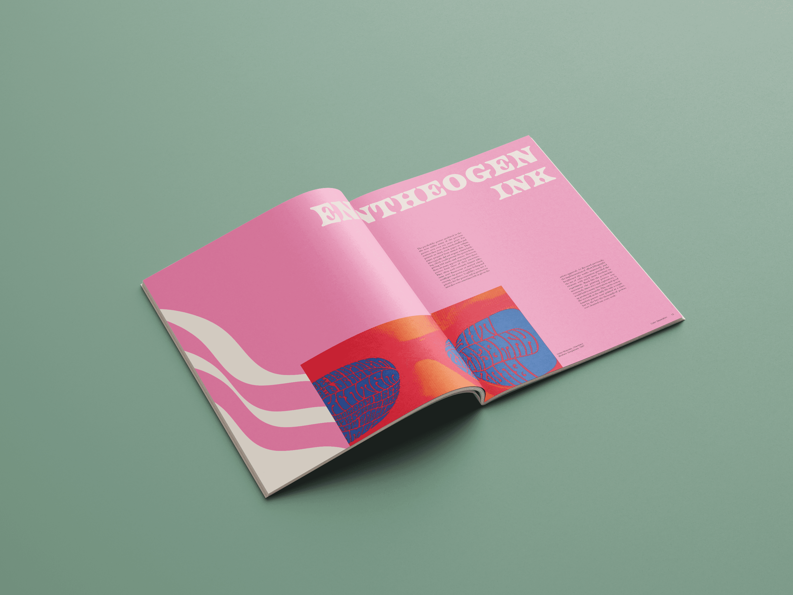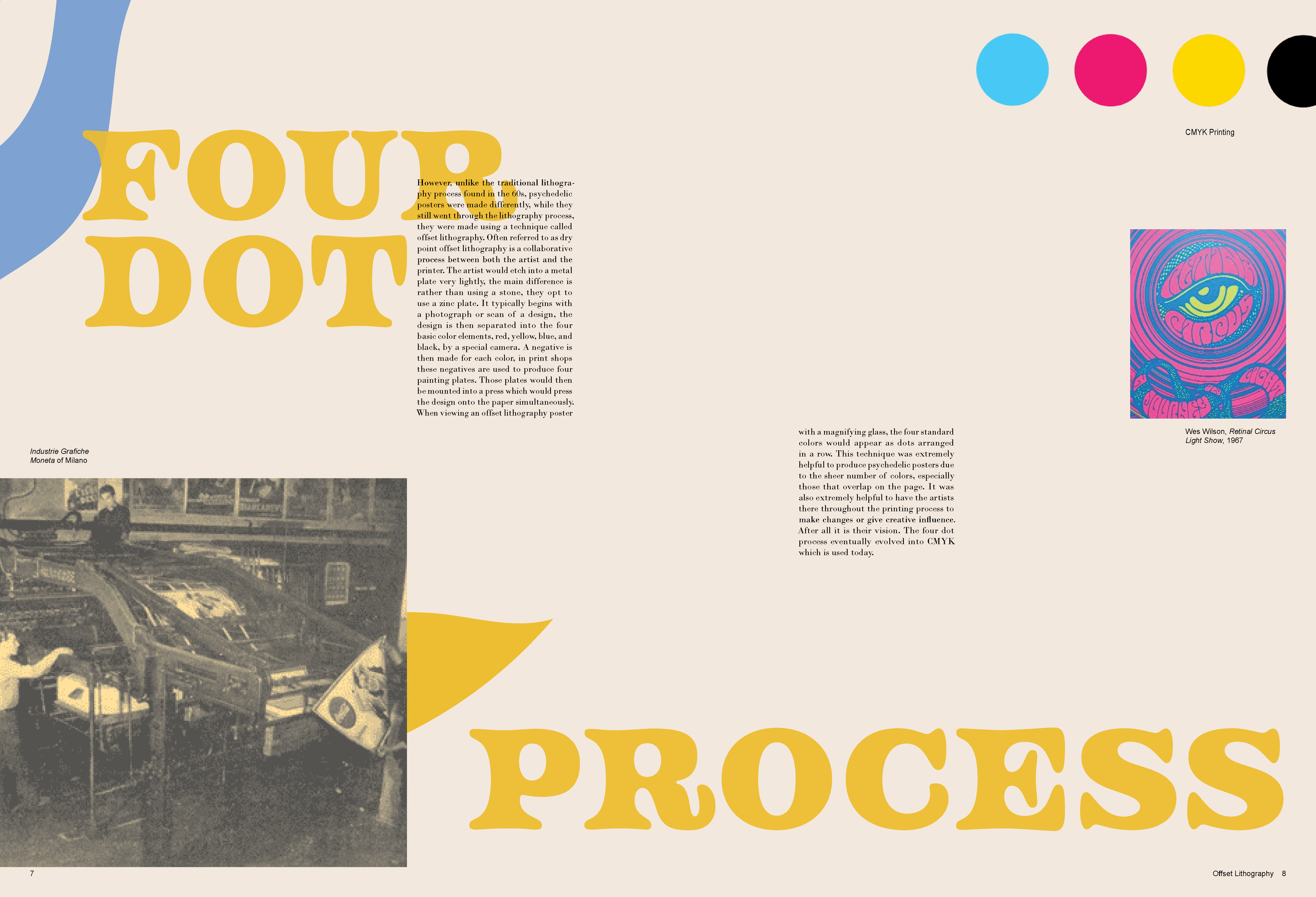 A monograph made to represent the poster designs of the Psychedelic 60s and 70s. In order to mimic this distinctive style, overlapping elements, vibrant colors and organic shapes were used on each spread, while the text still remains legible.