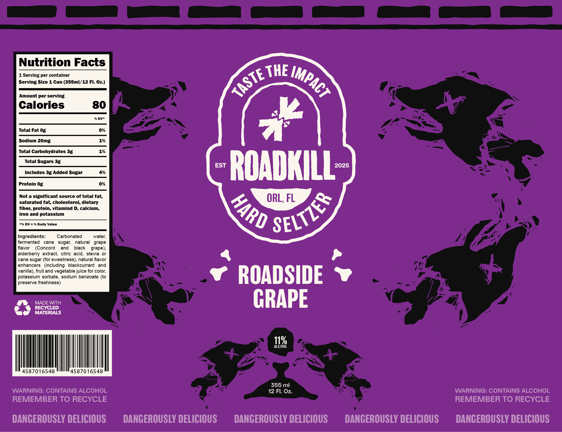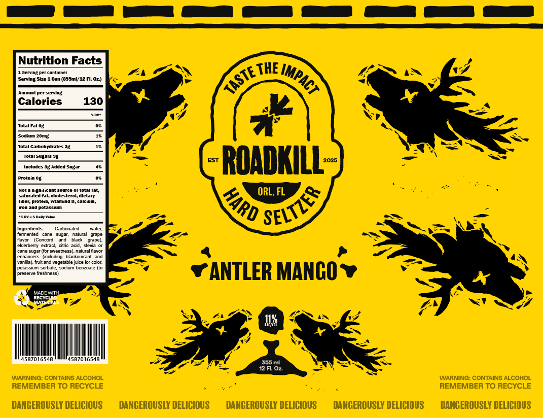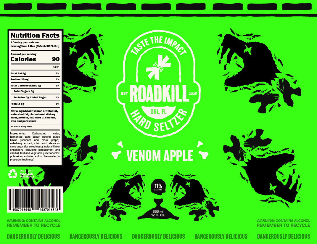 Roadkill Hard Seltzer, based in Orlando, FL, is built for the restless and unapologetically underground. With a raw, chaotic identity and bold visuals, it’s a brand that thrives on impact, not conformity.