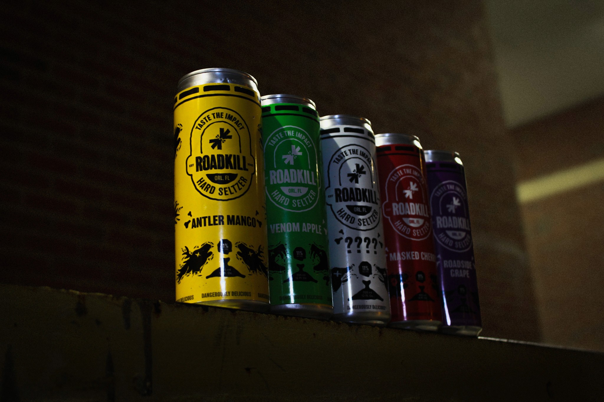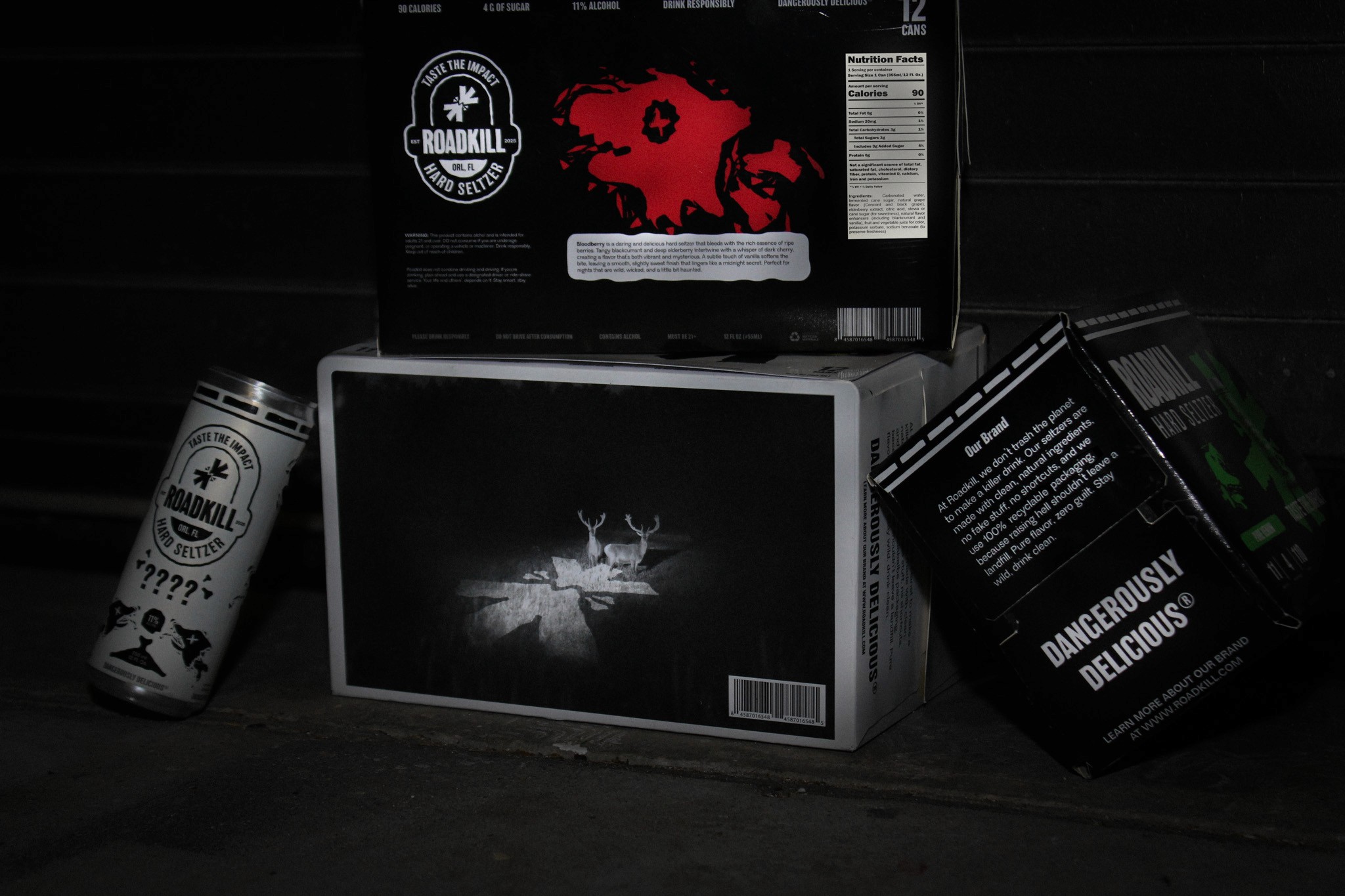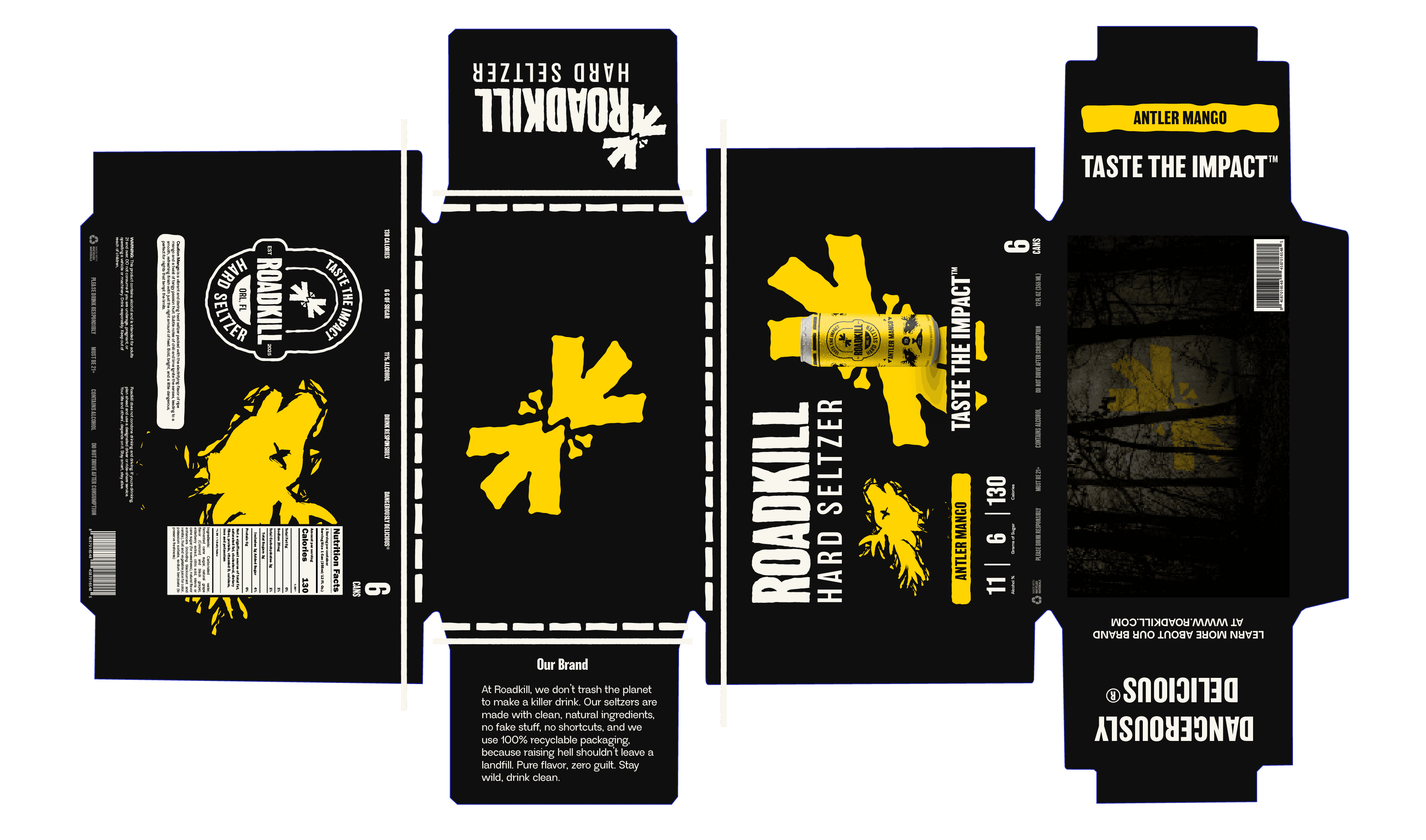 For this Roadkill line, the cans shift to a predominantly black base to signal a harder, more intense product. The high-contrast foundation feels heavier and more aggressive, while flavor colors are used as restrained accents to differentiate varieties without overpowering the identity. The existing flavor illustrations carry over unchanged, appearing sharper against the black background and clearly elevating the cans into a darker, bolder, higher-alcohol tier within the Roadkill lineup.