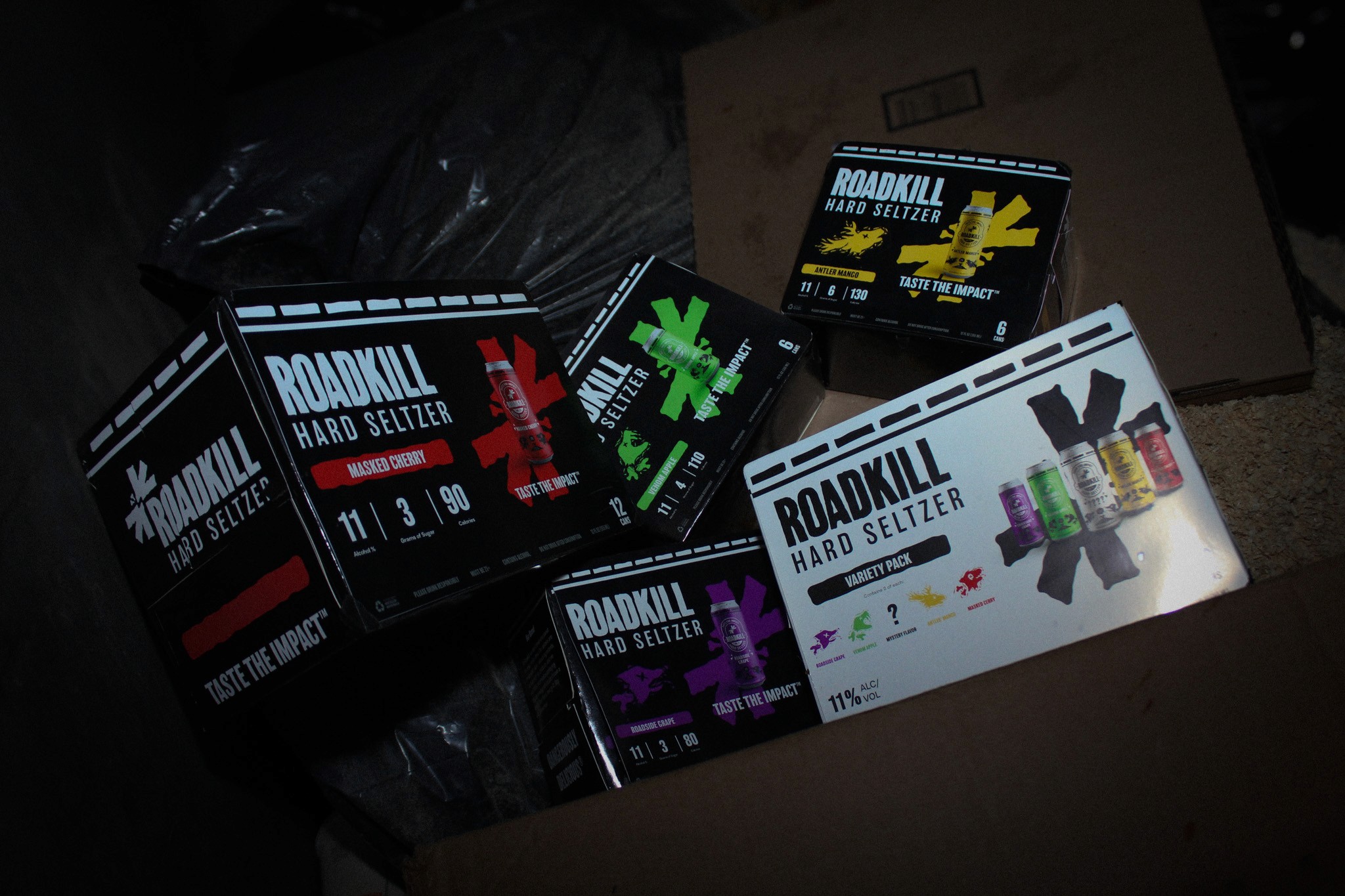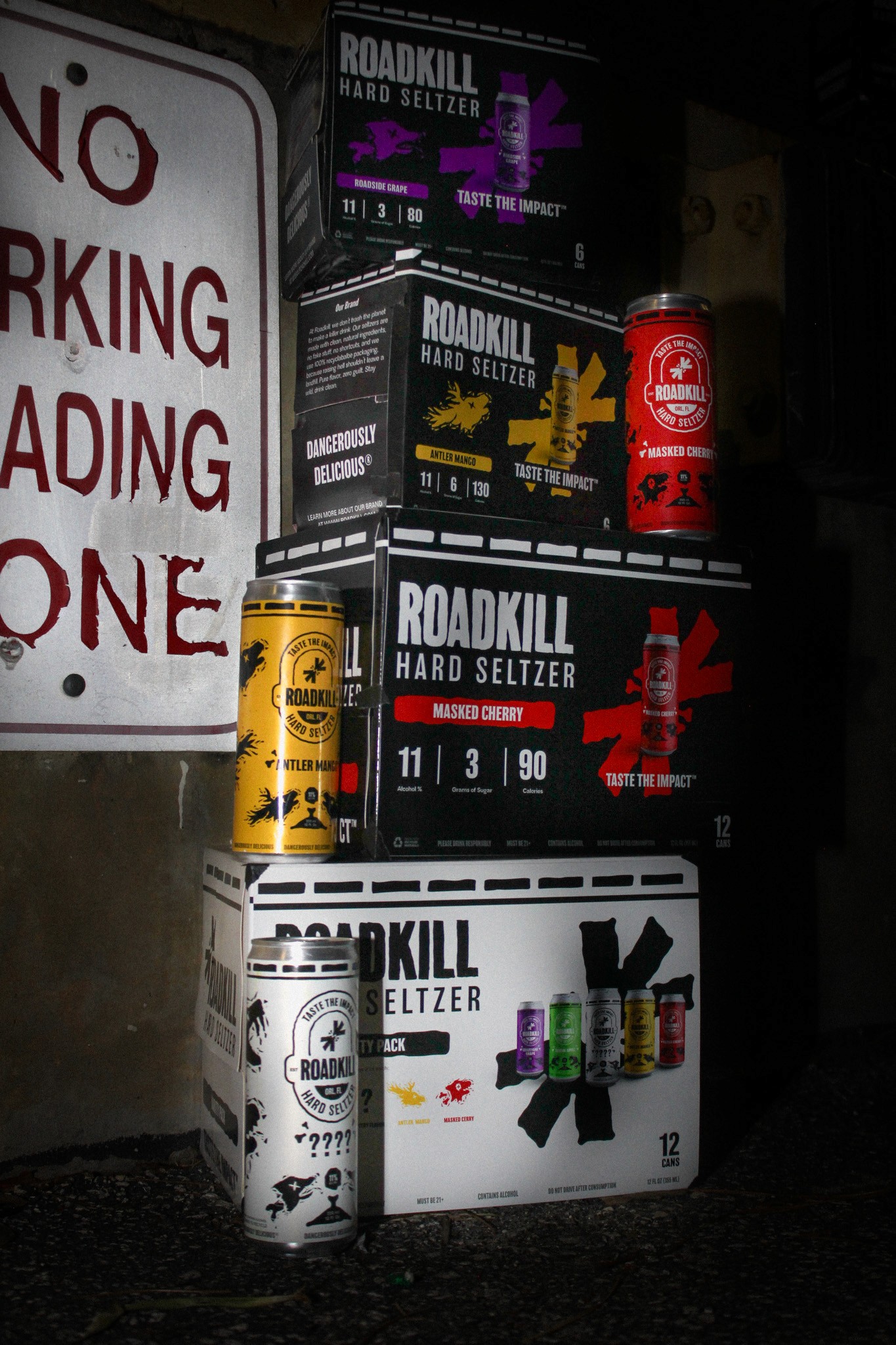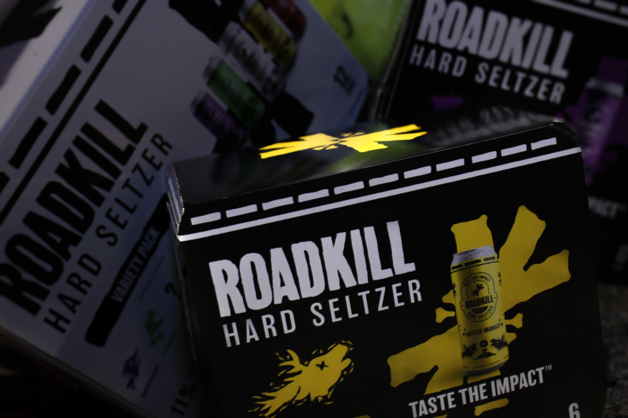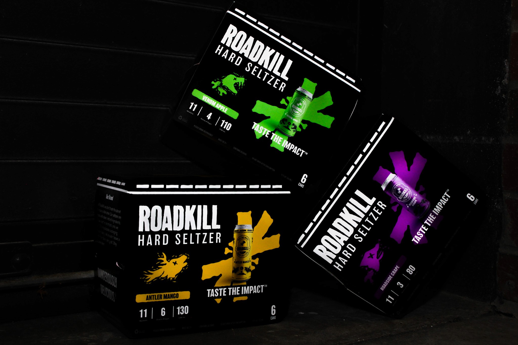 For this Roadkill line, the cans shift to a predominantly black base to signal a harder, more intense product. The high-contrast foundation feels heavier and more aggressive, while flavor colors are used as restrained accents to differentiate varieties without overpowering the identity. The existing flavor illustrations carry over unchanged, appearing sharper against the black background and clearly elevating the cans into a darker, bolder, higher-alcohol tier within the Roadkill lineup.