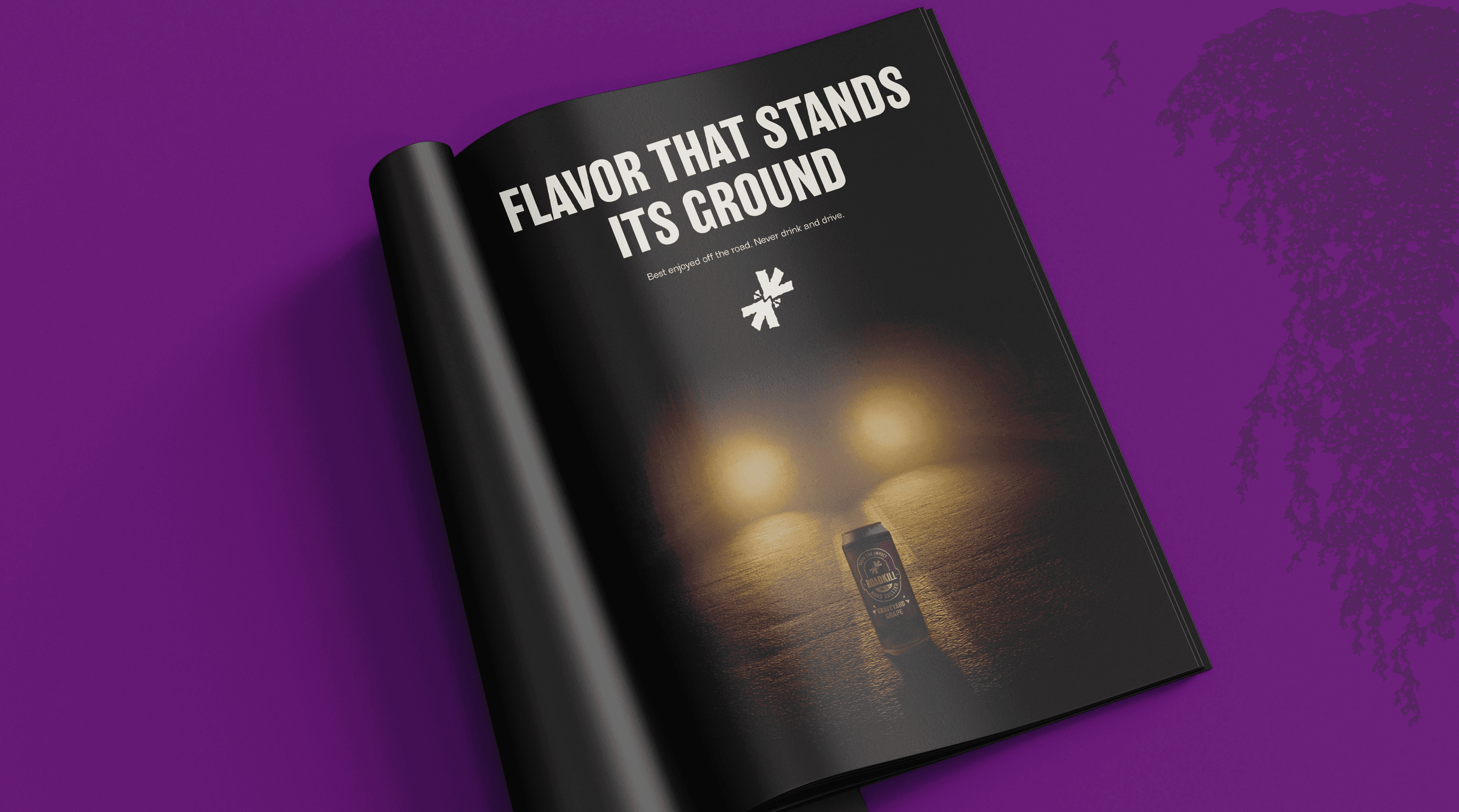 For Roadkill Hard Seltzer, we built a bold, unapologetic identity rooted in rebellion and grit. The brand book defines a raw system of distorted type, torn textures, and irreverent tone, while the magazine ad brings it to life with punchy copy and hand-crafted visuals—positioning Roadkill as a loud cultural statement for a 21–35 audience that rejects the mainstream.